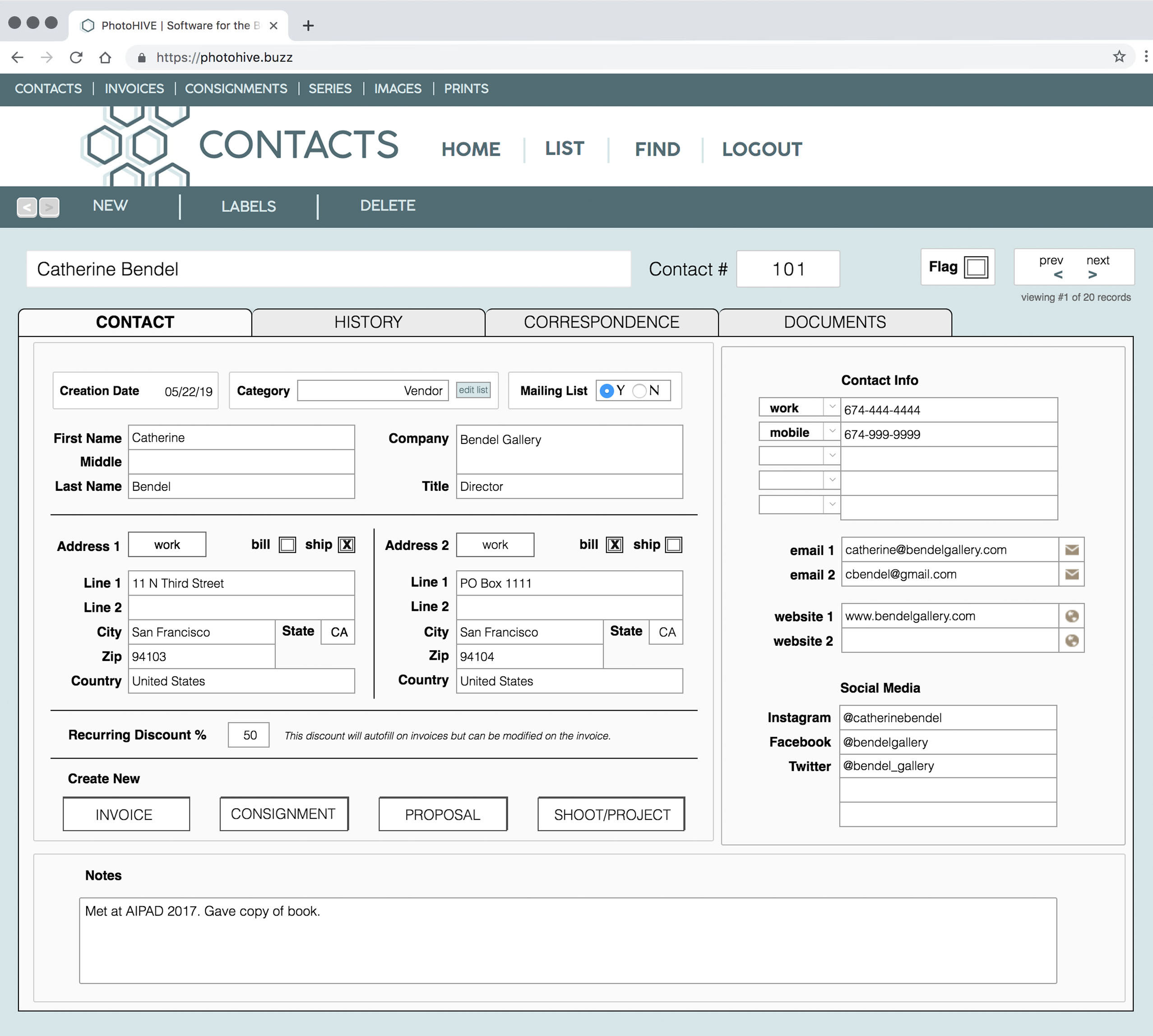 Access all of the details about your contacts in one place. Easily view their history including purchases, consignments, print orders, and correspondence. Quickly navigate from the client record to related transactions, images, or prints. Export mailing lists for painless import to email marketing platforms like Mail Chimp.