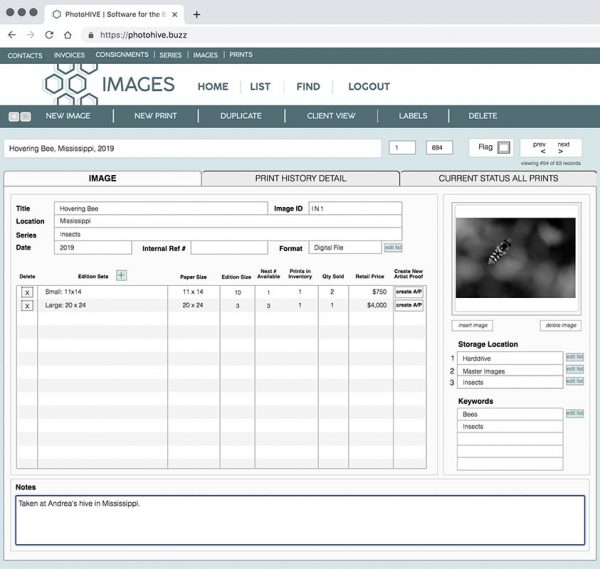 Each print has an individual record in the database where you can record the medium, location, paper & image size, keywords, important notes, and other details. Easily view the history of the print including consignments, consignment returns, sales, and the clients associated with these transactions.