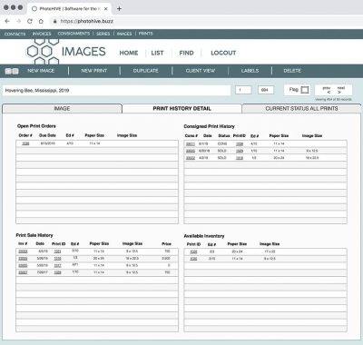 Easily view the history of a series or image, including sales, consignments, current inventory, print orders, and related clients. Generate print-friendly client views to share your series, images, and print availability with your galleries or clients. Here are just a few views associated with these features: