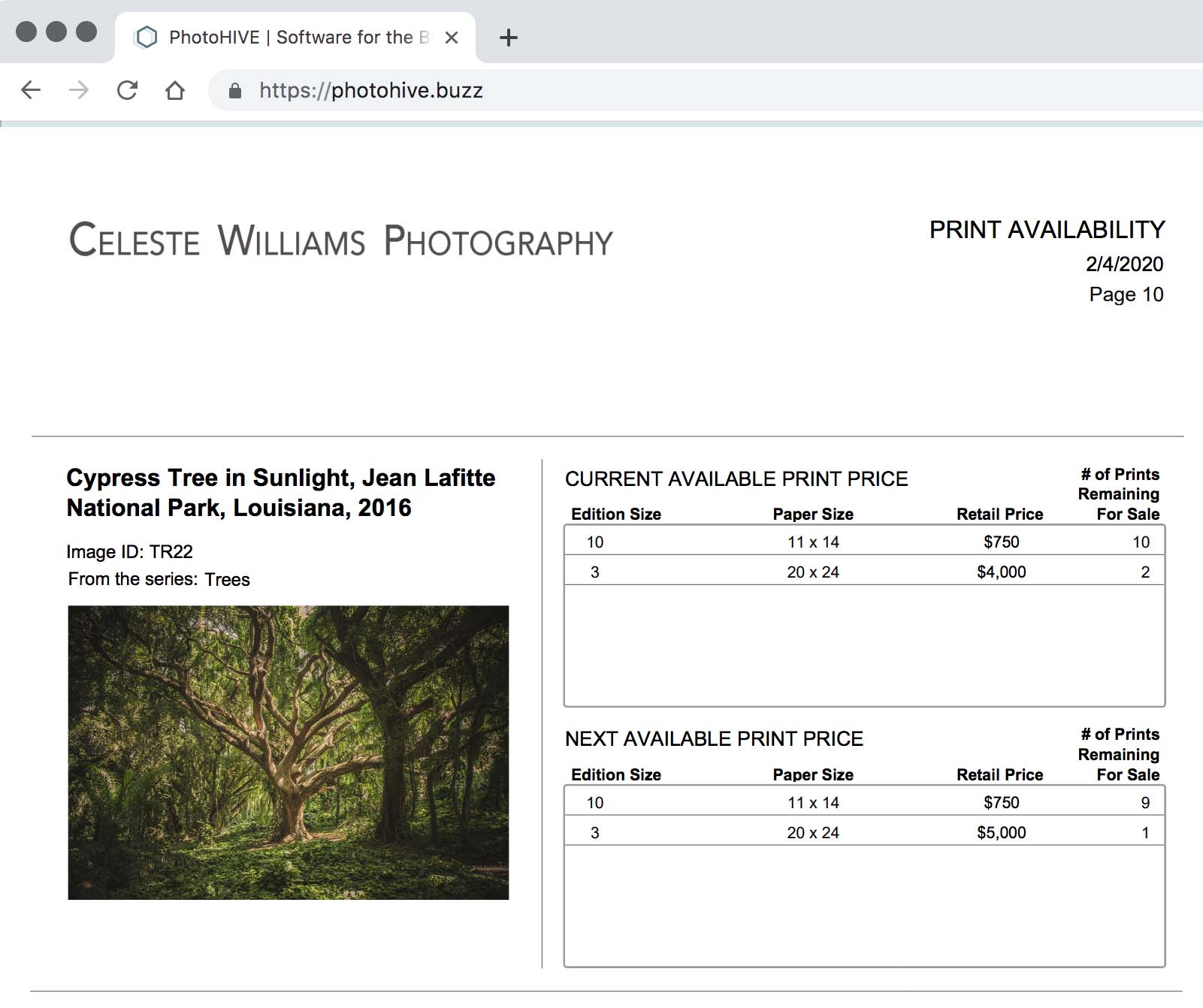 PhotoHIVE gives you the option to share a password-protected Gallery Portal with your galleries and clients. You select which images you want to be included in the portal and users can enter to search for current print availability. Users can choose to search for just one print or find all to create an up-to-date catalog of what is available with current prices. Woohoo we love this feature!